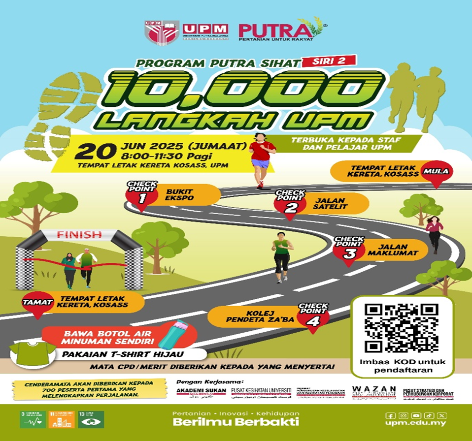 Serdang, 20 Jun 2025 – Naib Canselor UPM, Dato Prof. Dr. Ir. Ahmad Farhan Mohd Sadullah hari ini menyertai Program Putra Sihat 10,000 langkah siri 2. Aktiviti ini memberi dorongan kepada staf Universiti Putra Malaysia (UPM) untuk mengamalkan gaya hidup sihat menerusi gabungan aktiviti senamrobik serta berjalan kaki sejauh 10,000 langkah.